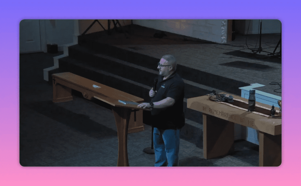 Speaker gesturing while delivering a sermon at a church pulpit with communion elements visible